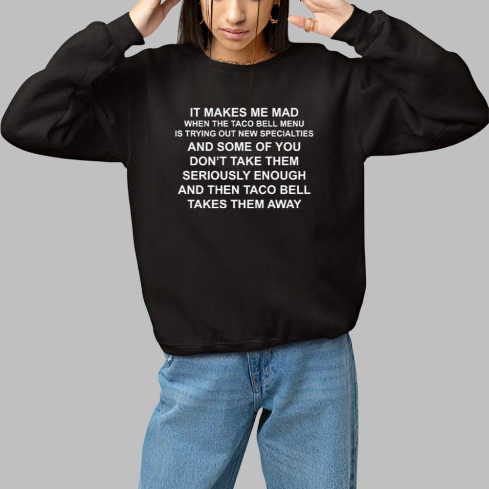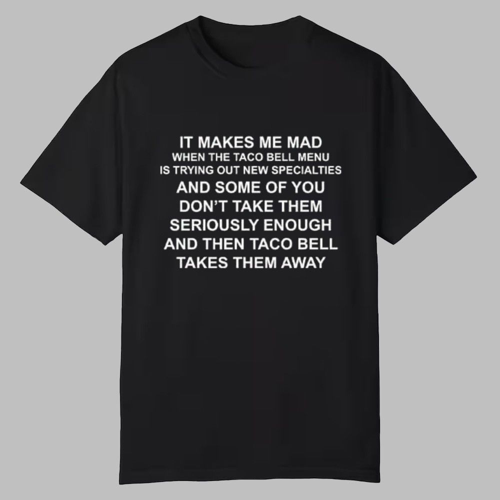 Our It Makes Me Mad When The Taco Bell Menu Is Trying Out New Specialties Shirt is the perfect way to show off your personality and style. Made of 100% cotton, they are designed to be comfortable and breathable all day long. With a wide variety of designs, colors, and styles available, you can find something that will add a unique flair to any outfit. Whether you’re looking for something cool, funny, or just plain unique, we have the perfect t-shirt for you.